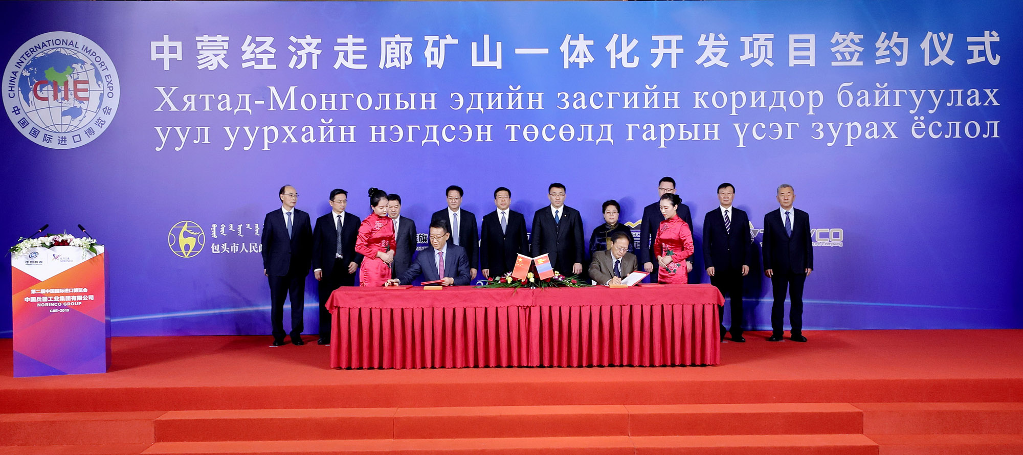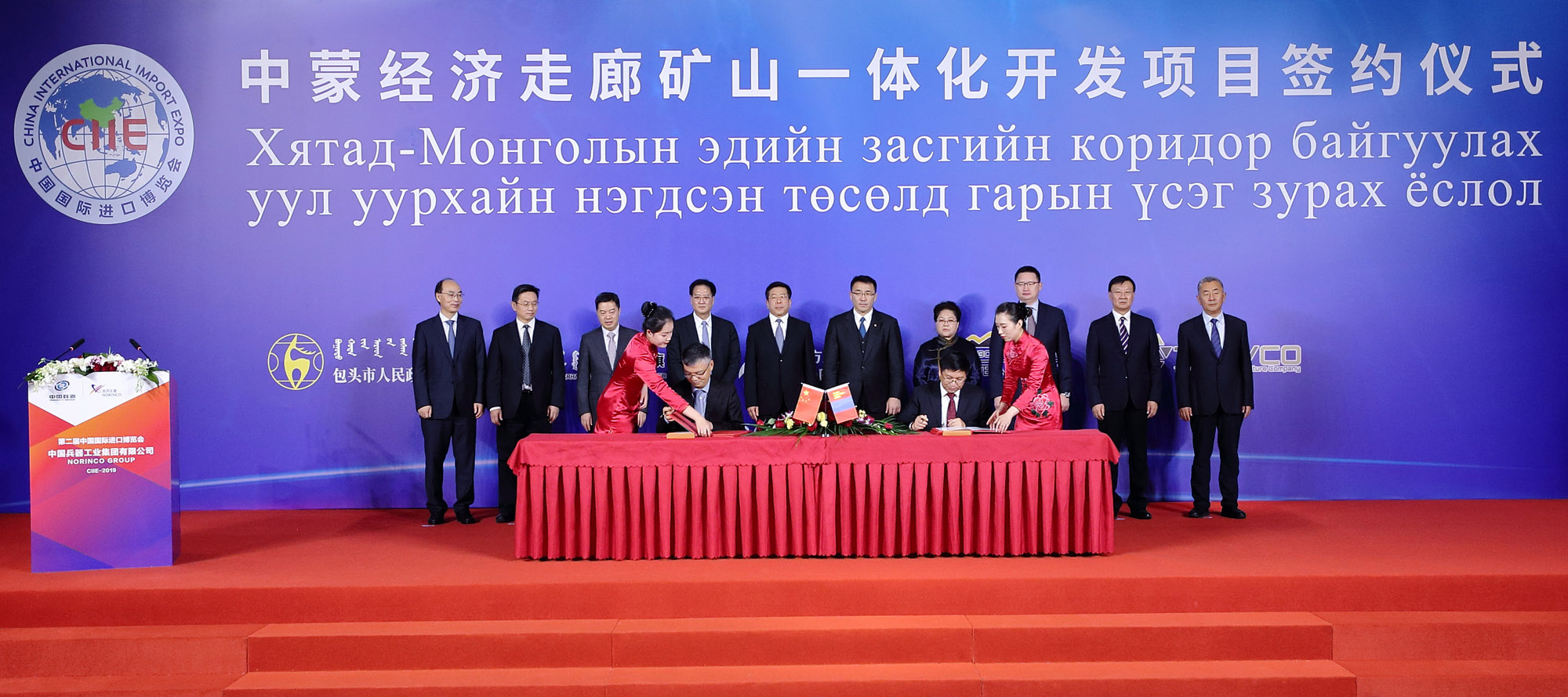 11月4日,第二屆中國國際進(jìn)口博覽會開幕前,在中國兵器工業(yè)集團有限公司董事長焦開河和蒙古礦業(yè)與重工業(yè)部部長蘇米亞巴扎爾·道古蘇仁、國務(wù)院國資委副主任任洪斌、內(nèi)蒙古自治區(qū)副主席艾麗華的共同見證下,中蒙經(jīng)濟走廊礦山一體化項目在上海簽約。簽約前,各相關(guān)方進(jìn)行了友好會談。
