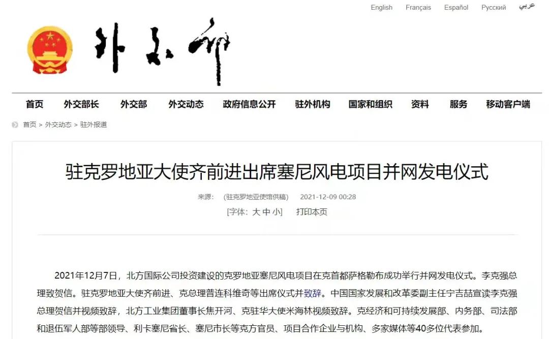 2021年12月7日,中國(guó)兵器工業(yè)集團(tuán)有限公司北方公司所屬北方國(guó)際投資、建設(shè)和運(yùn)營(yíng)的塞尼156MW風(fēng)電項(xiàng)目在克羅地亞首都薩格勒布隆重舉行并網(wǎng)發(fā)電儀式。李克強(qiáng)總理致賀信??肆_地亞總理安德烈·普連科維奇,中國(guó)駐克羅地亞大使齊前進(jìn)出席儀式并致辭。中國(guó)國(guó)家發(fā)展和改革委員會(huì)副主任寧吉喆宣讀李克強(qiáng)總理賀信并視頻致辭,中國(guó)兵器工業(yè)集團(tuán)有限公司董事長(zhǎng)焦開河、克駐華大使米海林視頻致辭。 中華人民共和國(guó)外交部報(bào)道 普連科維奇總理在致辭中表示,感謝李克強(qiáng)總理發(fā)來(lái)賀信,他與中國(guó)領(lǐng)導(dǎo)人一直非常重視塞尼風(fēng)電項(xiàng)目投資與建設(shè)。祝賀項(xiàng)目克服疫情與地震等影響,成功并網(wǎng)發(fā)電。增加清潔可再生能源、綠色電力對(duì)克乃至歐洲都很重要,克政府的重要戰(zhàn)略和目標(biāo)之一就是低碳發(fā)展和增加清潔能源供應(yīng)。塞尼風(fēng)電項(xiàng)目占克總發(fā)電量將達(dá)3.5%,對(duì)克實(shí)現(xiàn)2022年可再生能源比例30%目標(biāo)具有很大幫助。此次投資使北方國(guó)際成為在克最大的清潔能源投資企業(yè)。非常歡迎更多中國(guó)企業(yè)擴(kuò)大對(duì)克投資。 寧吉喆宣讀李克強(qiáng)總理賀信并視頻致辭時(shí)表示,2017年11月第六次中國(guó)—中東歐國(guó)家領(lǐng)導(dǎo)人會(huì)晤期間,在李克強(qiáng)總理和普連科維奇總理等中東歐16國(guó)領(lǐng)導(dǎo)人的共同見證下,塞尼項(xiàng)目簽署了協(xié)議。項(xiàng)目既是中國(guó)堅(jiān)定踐行綠色發(fā)展理念的具體體現(xiàn),也是中國(guó)深化與克羅地亞、與中東歐國(guó)家務(wù)實(shí)合作的生動(dòng)實(shí)踐。希望中克兩國(guó)政府部門,企業(yè)等有關(guān)各方共同努力、相互配合,運(yùn)營(yíng)好塞尼項(xiàng)目,打造出中歐綠色合作的樣板,帶動(dòng)兩國(guó)務(wù)實(shí)合作持續(xù)深入發(fā)展,造福兩國(guó)人民。