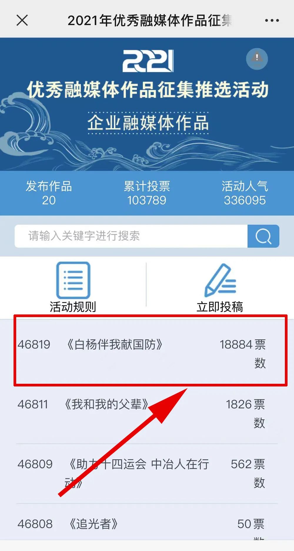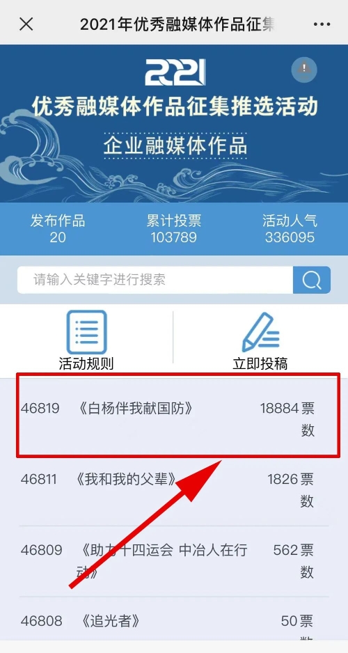 1.掃描下方二維碼,進(jìn)入初始界面,點擊“企業(yè)融媒體作品征集”,進(jìn)入投票界面點擊《白楊伴我獻(xiàn)國防》,點擊“投TA一票”;