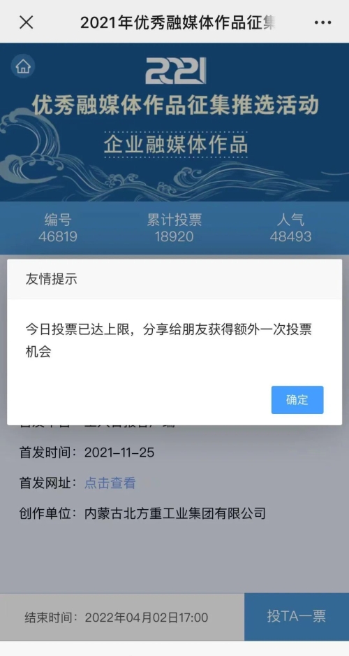 近日,由“文化強國”光明日報協(xié)同推廣平臺、光明網(wǎng)、北京師范大學(xué)新媒體傳播研究中心和光明天翼5G融媒實驗室共同主辦的“2021年優(yōu)秀融媒體作品征集推選活動”開啟線上投票環(huán)節(jié),經(jīng)過專家委員會評審,中國兵器工業(yè)集團(tuán)北重集團(tuán)《白楊伴我獻(xiàn)國防》音樂MV入選活動前二十名,并進(jìn)入網(wǎng)絡(luò)投票環(huán)節(jié)