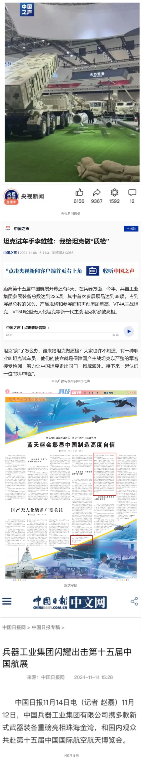 11月12日至17日,第十五屆中國國際航空航天博覽會在廣東省珠海市舉行,中國兵器工業(yè)集團有限公司突出數(shù)智賦能軍貿(mào)合成旅作戰(zhàn)體系,帶來了一系列新產(chǎn)品、新技術、新體系,全方位展示我國陸軍外貿(mào)武器裝備發(fā)展最高水平、最新突破、最前沿成果,立體化呈現(xiàn)陸域信息化、智能化、體系化作戰(zhàn)能力,受到了全社會廣泛關注。航展期間,央視綜合頻道《新聞聯(lián)播》、央視新聞頻道《新聞直播間》《長空鵬程》報道兵器工業(yè)集團參展情況,重點介紹了VT4A1主戰(zhàn)坦克、輪式裝甲火炮、新一代陸域指控信息系統(tǒng)、無人戰(zhàn)車、民用無人運輸機及地面裝備演示有關內(nèi)容。央視新聞推出航展直播節(jié)目《藍天之約》,邀請兵器工業(yè)集團嘉賓對參展情況、裝備動態(tài)演示作了講解。